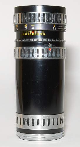 Daten: 5 Linsen (Objektivkopf abschraubbar), Vorwahlblende mit Rasten 2,8-32, Bildwinkel 18°, Filtergewinde M54, Naheinstellbereich ab 1m, Gewicht 690g