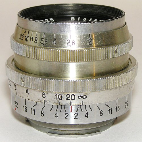 "Bi-Metall"-Biotar 1:2 f=5,8cm Nr. 2.825.925, bereits mit T-Vergütung (!), Baujahr um 1945/46. Bei diesem Objektiv besteht der hintere Fassungsteil (mit der Tiefenschärfenskala) aus verchromtem Messing und stammt offenbar aus Vorkriegsbestand. Der Einstellbereich der Blende wurde bei den ab etwa 1939 gebauten Biotaren bis Blende 22 erweitert.
